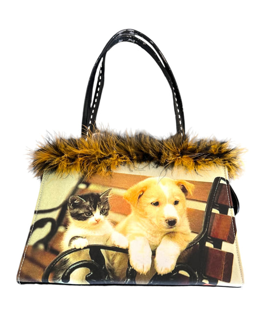 Vintage Graphic Animal Friends Bag with Feather Trim