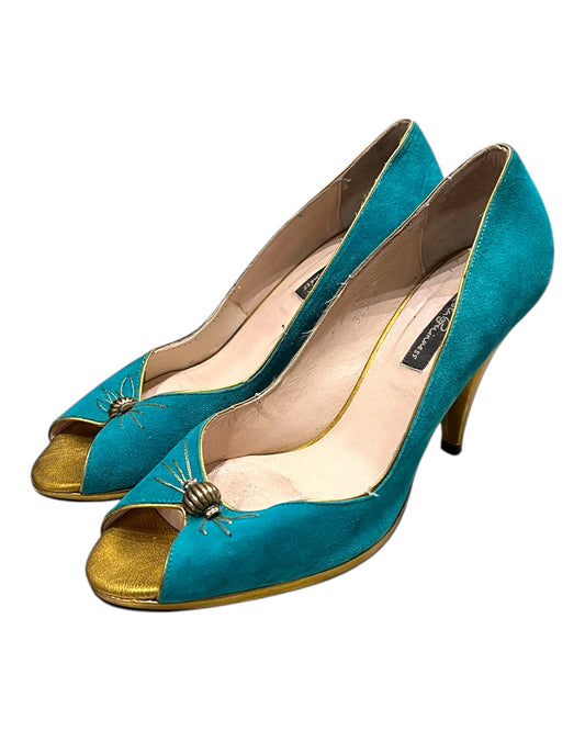 Vintage Lulu Guinness Turquoise and Gold Suede Peep-Toe Heels