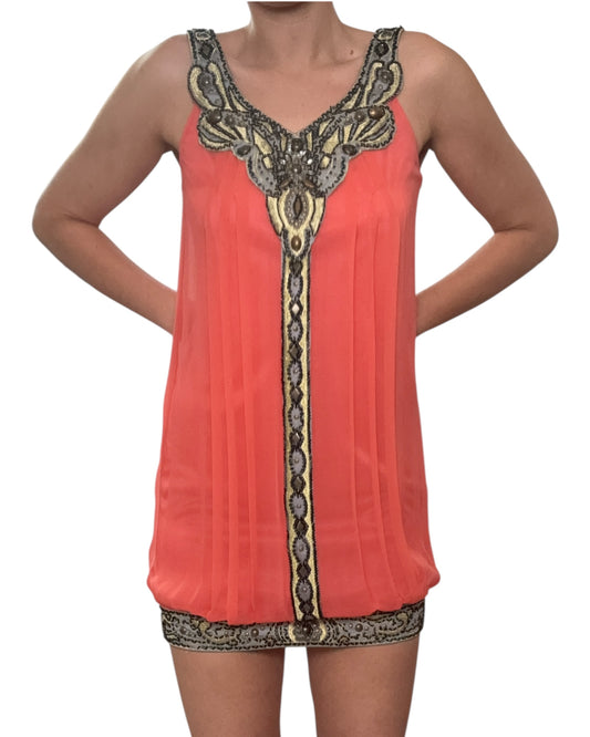 Vintage Sue Wong Silk Pleated Peach Embellished Mini Dress